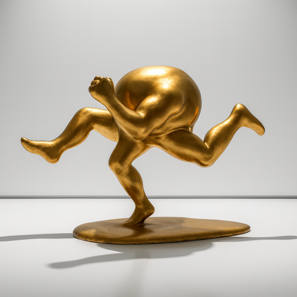 This sculpture depicts an egg with three legs and two hands dashing through space, blending humor and absurdity to explore themes of life, imbalance, and the pursuit of meaning. The egg, a symbol of life and potential, is anthropomorphized, breaking its fragile, static image to embody vitality. The asymmetrical three-legged design challenges notions of balance, symbolizing life’s imperfections and chaos, while critiquing society’s obsession with perfection and achievement.